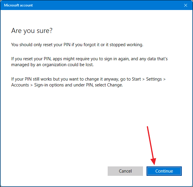 Step 3: A window will appear asking you to confirm that you want to reset your PIN. Click Continue.