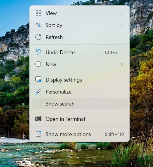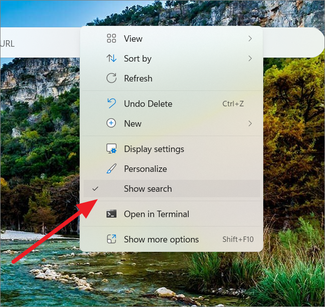 Step 1: Right-click on any empty space on your desktop. In the context menu that appears, click on the 'Show search' option (which will be checked).