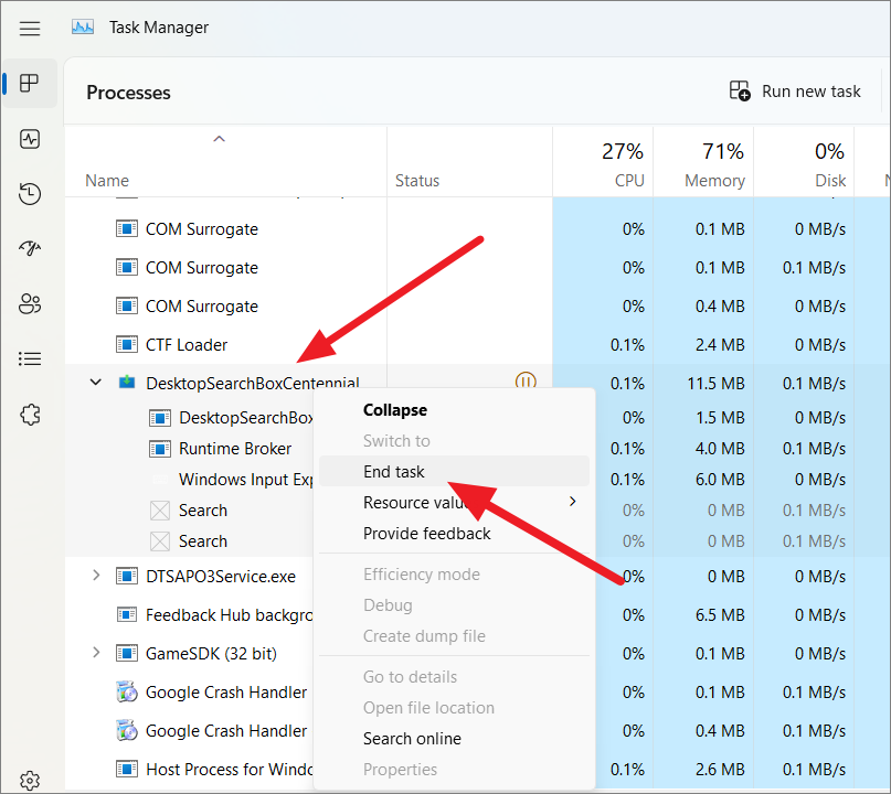 Step 4: In Task Manager, locate the process named 'DesktopSearchBoxCentennial...'. Right-click on it and select 'End task' to terminate the process.