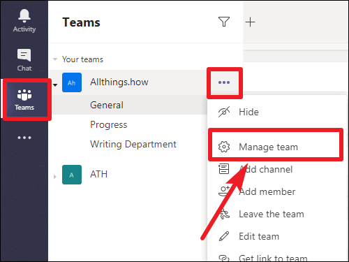 Step 2: Identify the team from which you want to remove a member. Click on the More options icon (three-dot menu) next to the team name, and then select Manage team from the dropdown menu.