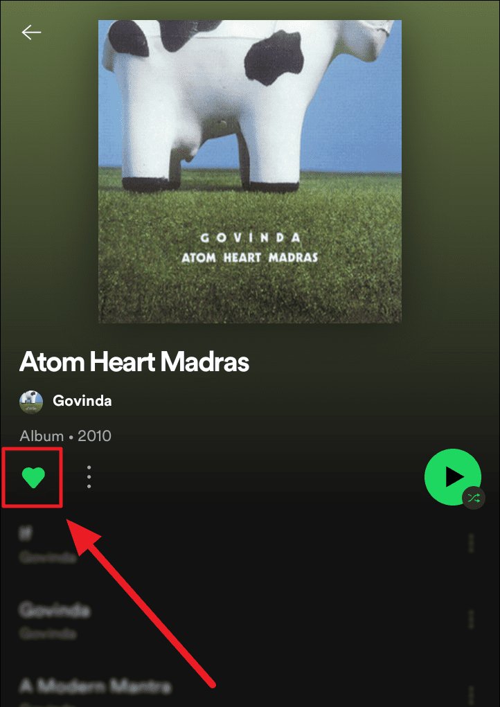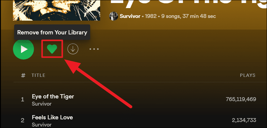 Method 2. Stay on the ‘Albums’ tab, locate the album you want to remove and click to open it. Now, much like playlists, albums are also liked by you to find a place in your library. So, click the green ‘Heart’ (like/love/following) icon, also known as the ‘Remove from Your Library’, to make it just an outlined heart.