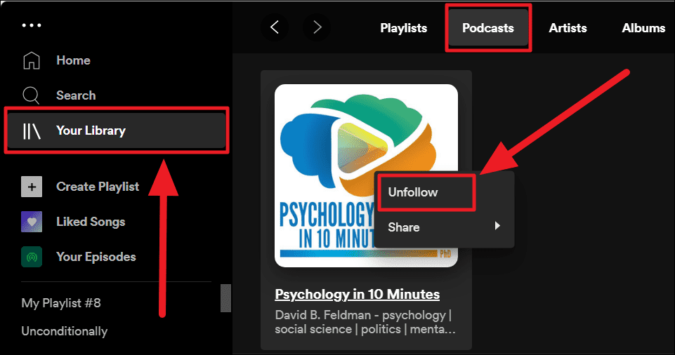 Method 1. Launch Spotify on your computer and click the ‘Your Library’ option to the top left of the screen. Choose the ‘Podcasts’ tab from the categories on the right. Then, navigate to the podcast you want to remove from your library and double-finger tap on it. Select ‘Unfollow’ from the menu.