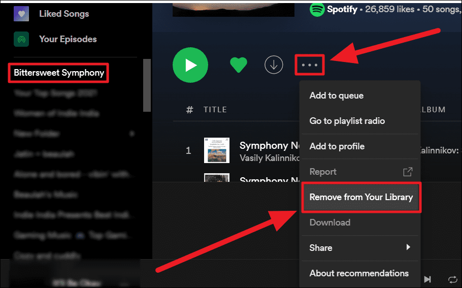 Method 3. Select the playlist you want to remove from your library on the left margin, then click the ellipsis icon (three horizontal dots) below the playlist’s credentials on the right. Now select ‘Remove from Your Library’ from the menu.