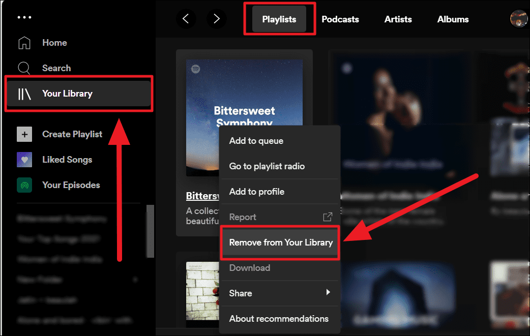 Method 4. Click the ‘Your Library’ option on the left menu of the screen. Then, click on the ‘Playlists’ tab on the right. Scroll through your playlists and double-finger tap on the playlist you want to remove. Select ‘Remove from Your Library’ from the context menu.