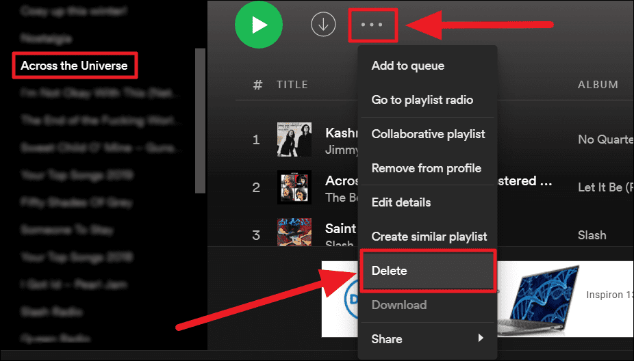 Or click to open the playlist from the left margin, and click the ellipsis icon (three horizontal dots) below the playlist’s info on the right. Select ‘Delete’ from the menu.
