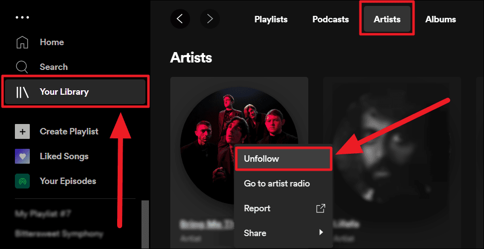 Method 1. Launch Spotify on your desktop and click ‘Your Library’ from the left margin. Now, select the ‘Artists’ tab on your library screen.