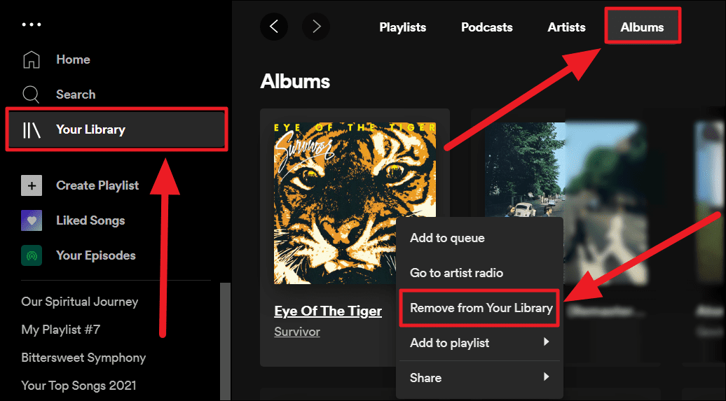 Method 1. To remove albums from your library, click the ‘Your library’ option from the left margin of your Spotify desktop app’s screen. Select the ‘Albums’ tab on the right. Scroll through your albums, find, and double-finger tap on the album you want out of your library, and select ‘Remove from library’ from the menu.