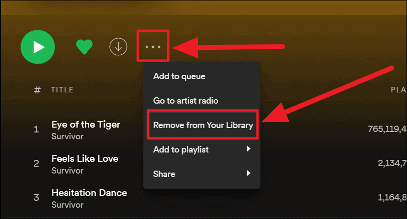 Method 3. Open the album you want to remove from your library either by manually searching for it or by locating it on the ‘Albums’ tab of your library and click the ellipsis icon (three vertical dots) next to the ‘Heart’ icon. Select the ‘Remove from your library’ option in the menu to remove the album from your library.