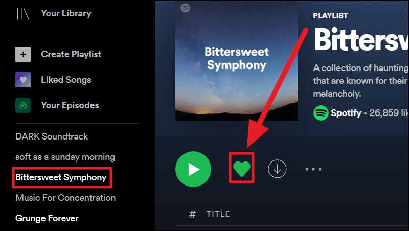 Click to open the playlist from the left screen of your Spotify desktop app and hit the now green ‘Heart’ icon to turn it into an outlined heart.