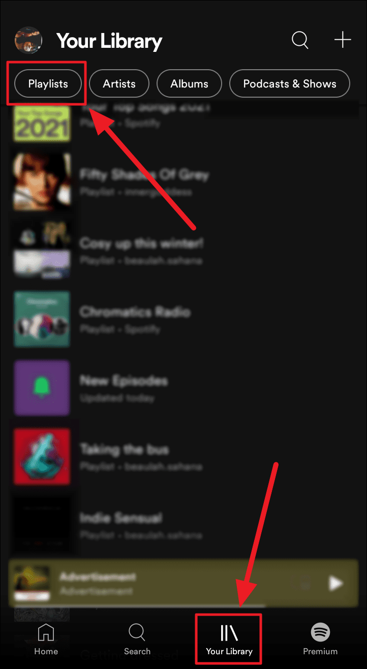 Method 1. Launch Spotify on your phone and tap the ‘Your Library’ button to the bottom left of the screen. Now, select the ‘Playlists’ tab to narrow down the search.