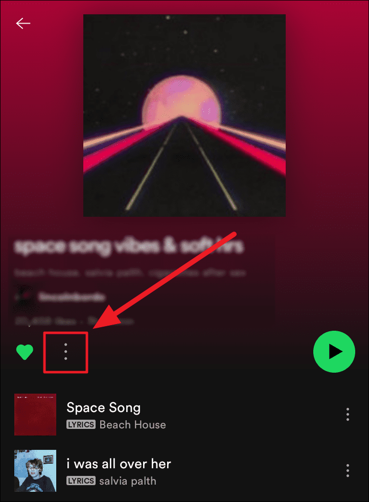 Method 3. Open the playlist, and tap the ellipsis icon (three vertical dots) next to the ‘Heart’ button.