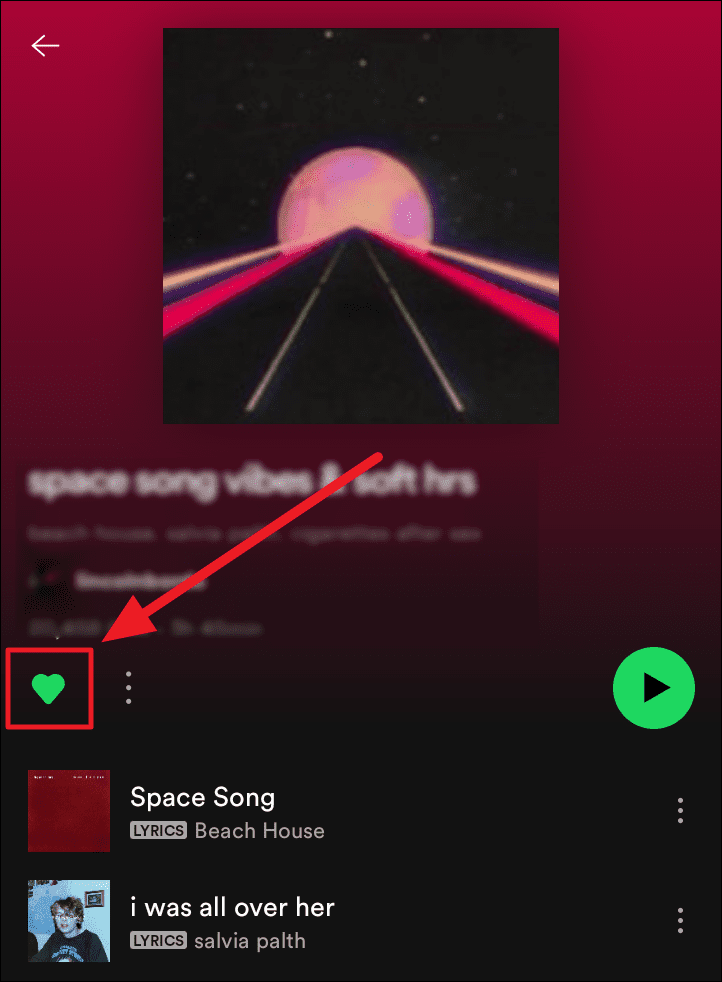 Method 2. Open the playlist you want to remove, and tap the green ‘Heart’ button below the playlist’s info to turn it into a colorless, outlined heart.