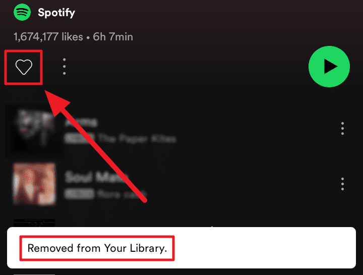 You’ll be notified of the removal. If you instantly regret the decision, click the outlined ‘Heart’ button again to make it green and add the playlist back to your library.
