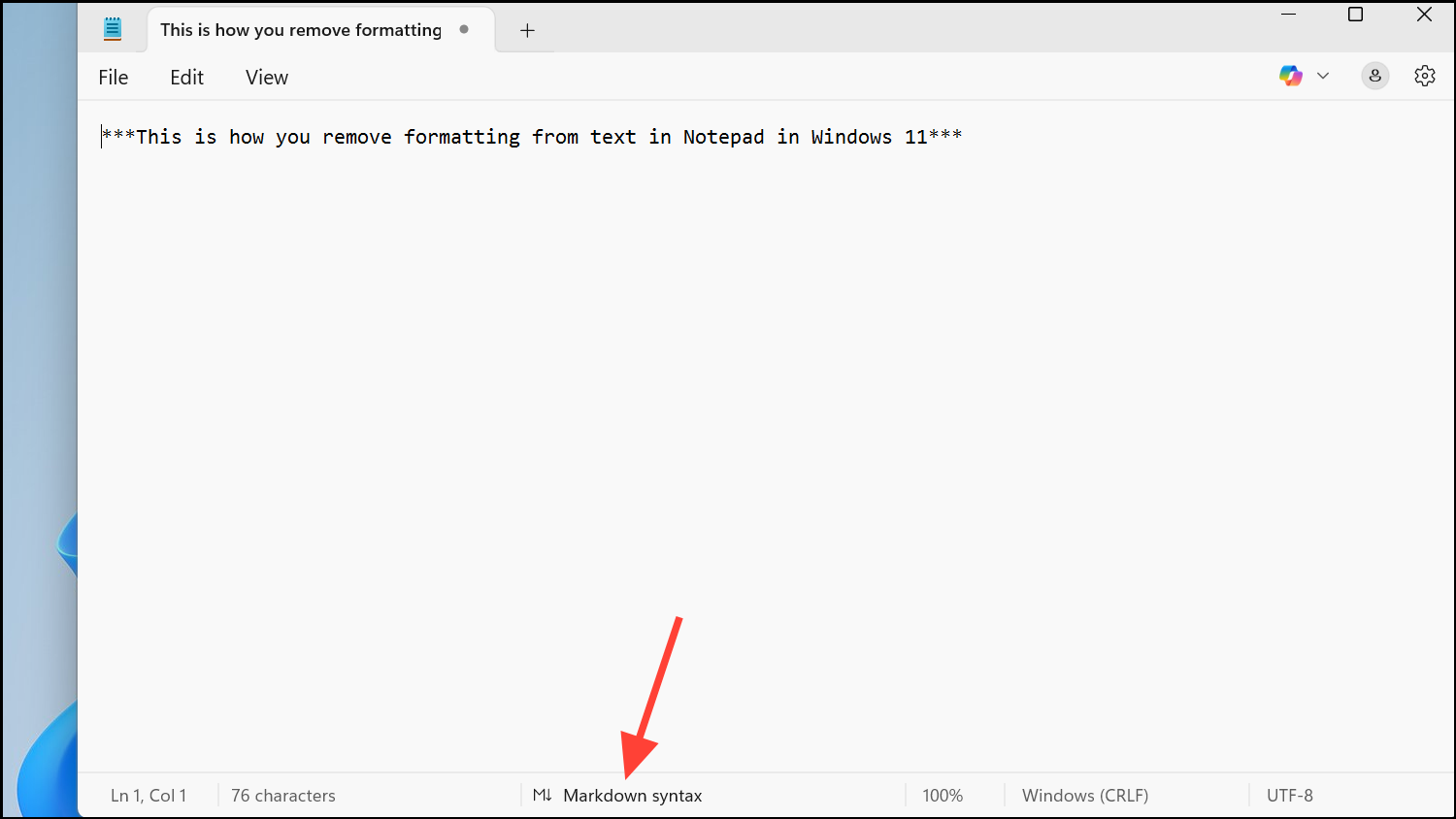 Step 4: To ensure you’re viewing plain text, you can switch between formatted Markdown and raw Markdown syntax using the View menu or the toggle button in the status bar at the bottom of the Notepad window. The Markdown syntax view displays only the plain text with Markdown symbols, while the formatted view shows styled text.
