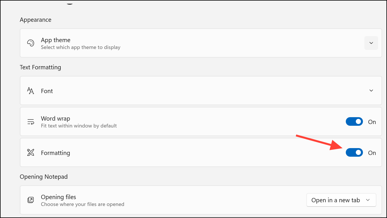Step 4: Exit Settings by clicking the back arrow at the top left. Notepad will now function strictly as a plain text editor, automatically removing all formatting from pasted or typed content.