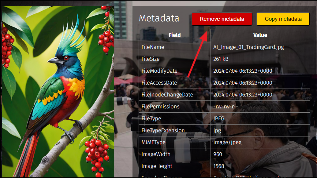 - Once your image is uploaded, you will get two options - 'Remove Metadata' and 'Copy Metadata'. Click on the 'Remove Metadata' button.
