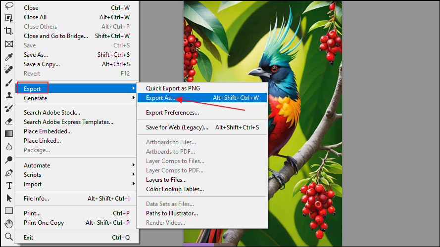- Go to the File menu and then to the 'Export' option. Click on the 'Export as' option.