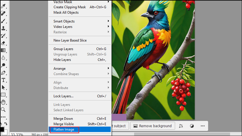 - In the menu that appears, click on the 'Flatten Image' option, which will merge all the layers together into a single one.