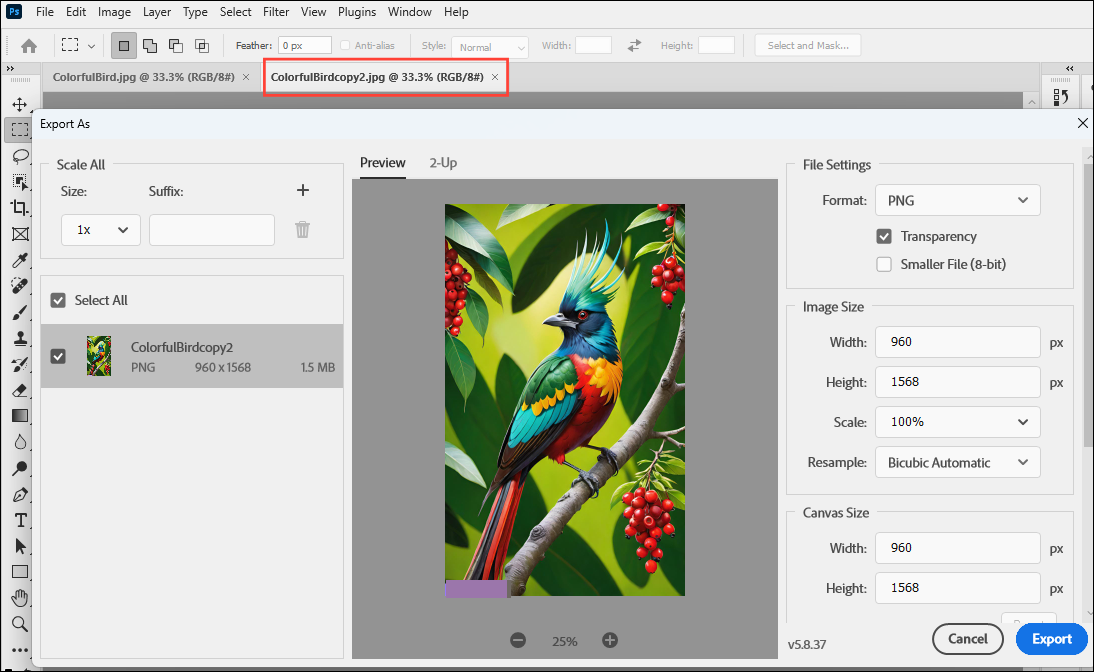 - While exporting, check to see that Photoshop does not add any AI labels to the image while exporting. If it does not, click on the 'Export' button on the lower right to export the image.