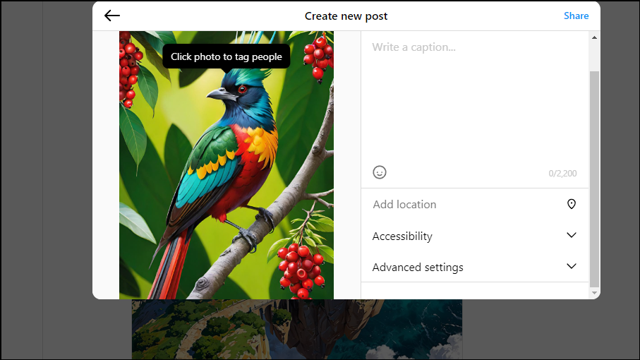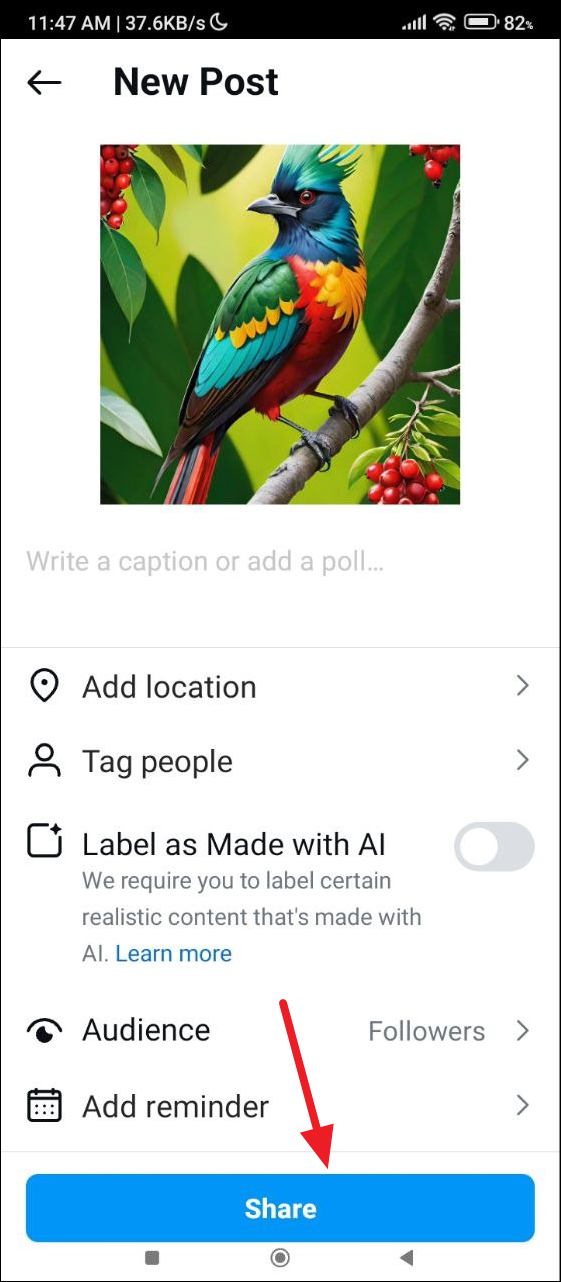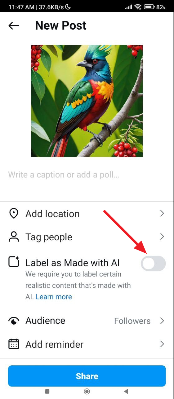 - If it is already off, turn it on and then off again. Finally, tap on the 'Share' button to post your image without the AI tag.