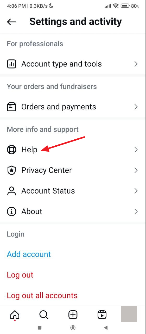 - On the 'Settings and Activity' page, scroll down to the 'More Info and Support' section and tap on the 'Help' option.