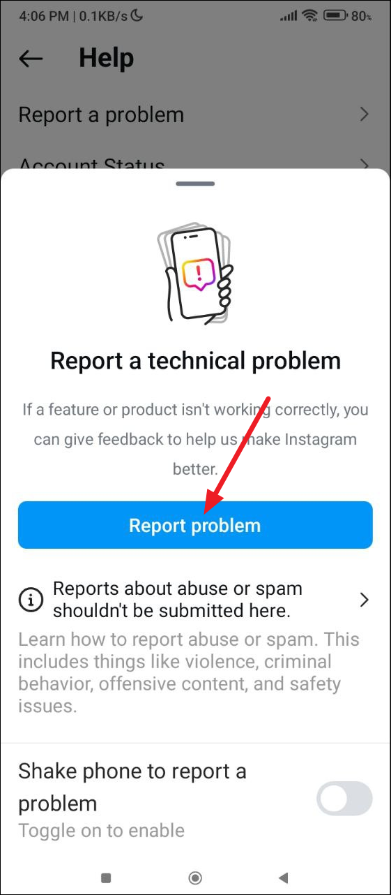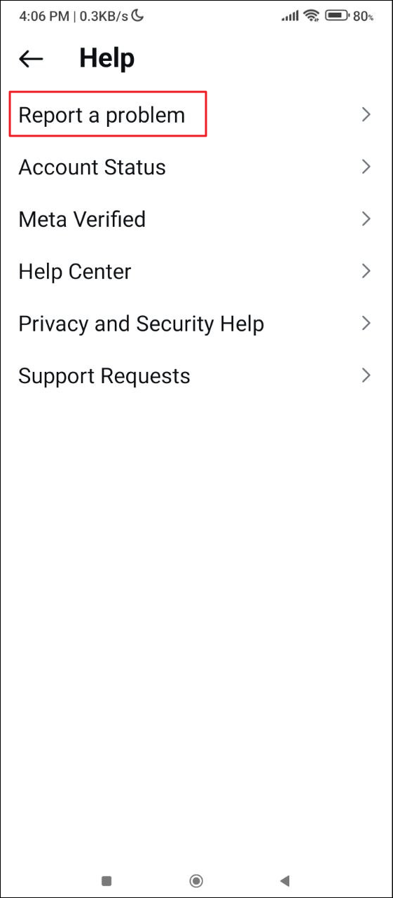 - Then, tap on the 'Report a Problem' option on the 'Help' page.