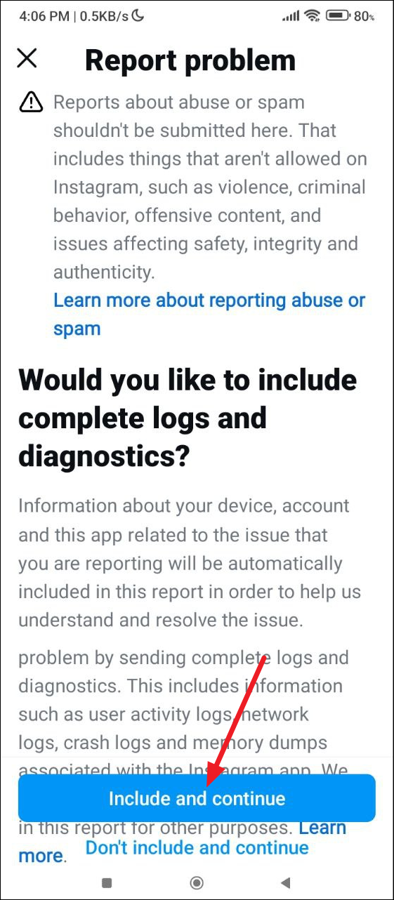 - On the next page, you can choose to include logs and diagnostics with your report or send your report without them. Tap on either option to continue.