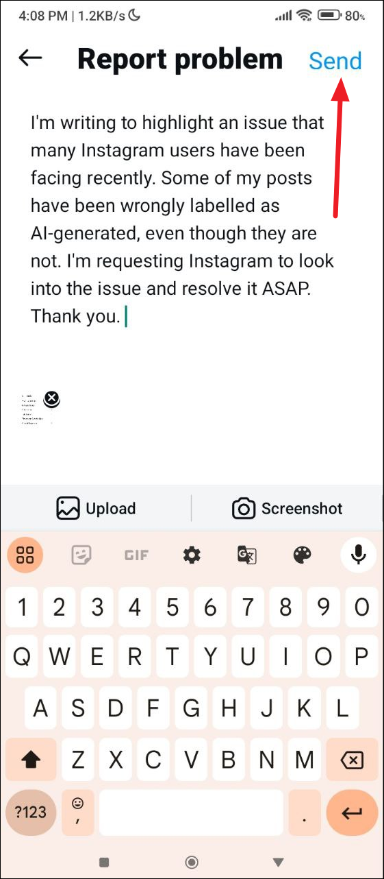 - Once you're done, tap on the 'Send' button on the top right to report your problem.