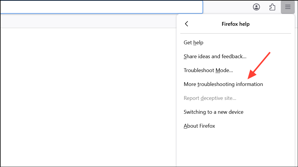 Step 1: In Firefox, open the menu and select Help > More Troubleshooting Information.