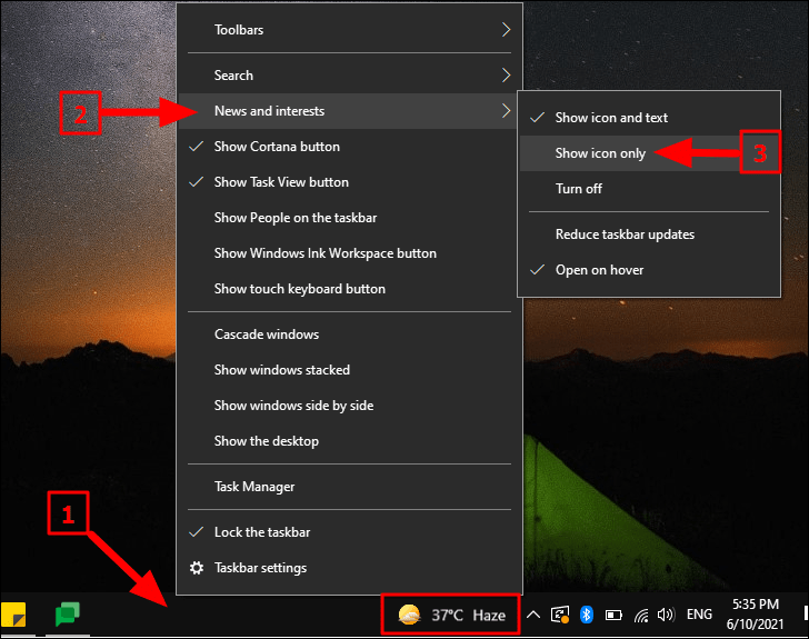 By default, the ‘News and Interests’ widget shows live weather on the taskbar. Unfortunately, Microsoft just chose to design it that way. Live weather updates could be helpful in some regions where you cannot tell when it’s going to rain, it keeps you in the know, but placing it on the Taskbar is a nightmare for many users.