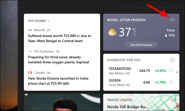 You will now find the ‘Weather Card’ at the top-right. Next, click on the ellipsis at the top-right corner of the tile to launch the menu.