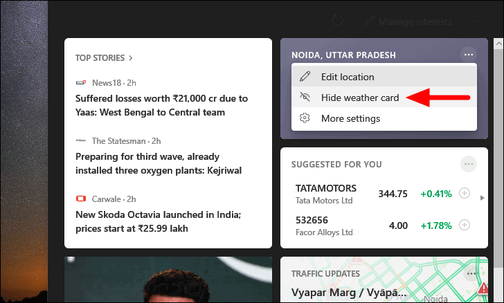 The ‘Weather Card’ will not be visible anymore on the ‘News and Interests’ widget. You can similarly hide other tiles/cards as well. In case, you want to unhide the card, the process ain’t that straightforward.