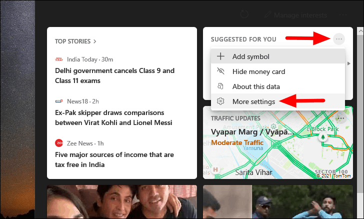 To unhide the ‘Weather Card’ or another information card that you have hidden, right-click on the ellipsis for any other visible card and select the ‘More settings’ option.