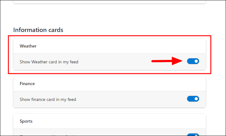 The ‘Experience Settings’ tab of ‘Micosoft Edge’ browser will show. Locate the ‘Weather’ option under ‘Information cards’, and click on the toggle next to it to enable the card.
