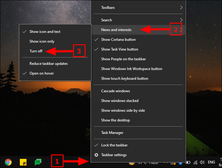 To disable the ‘News and Interest’ widget, right-click on any empty portion of the ‘Taskbar’, hover the cursor over ‘News and interests’, and then select ‘Turn off’ from the menu that appears.