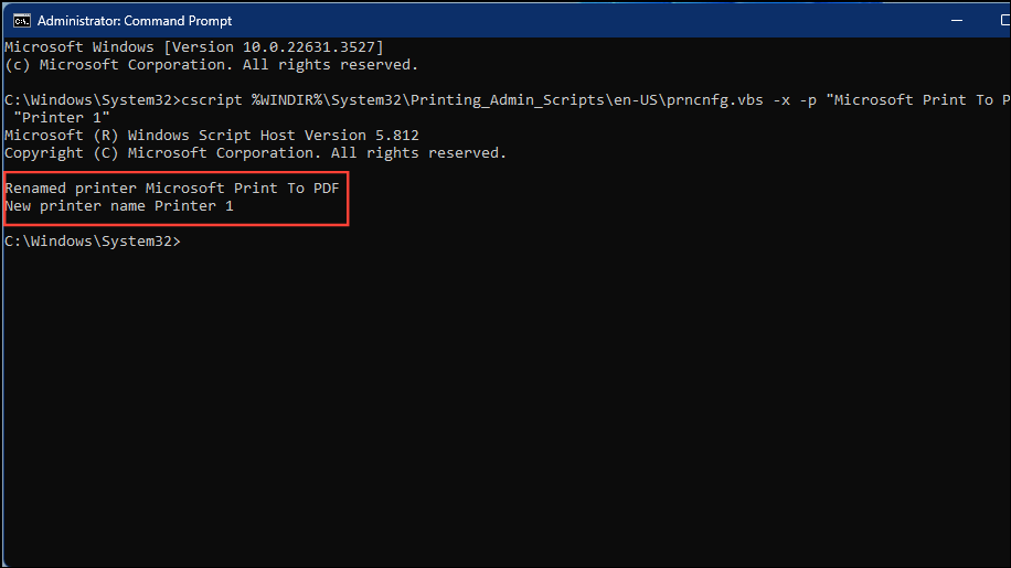 Step 3: After running the command, you should see a confirmation message indicating that the printer has been renamed successfully.