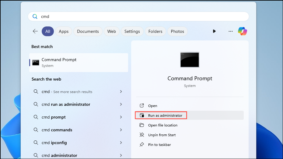 Step 1: Click on the Start menu, type cmd in the search field, and choose 'Run as administrator' to open the Command Prompt with administrative rights.
