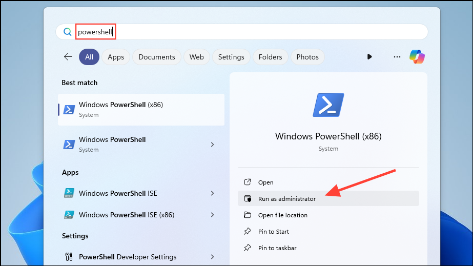 Step 1: Open the Start menu, type PowerShell in the search bar, and select 'Run as administrator' to launch PowerShell with administrative privileges.