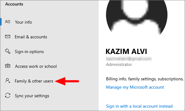 In the Account Settings, select ‘Family and other users’ from the list of options on the left.