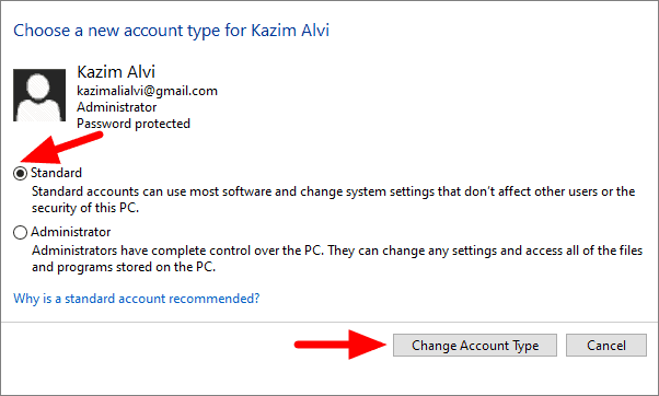 Select ‘Standard’ and then click on ‘Change Account Type’ at the bottom.