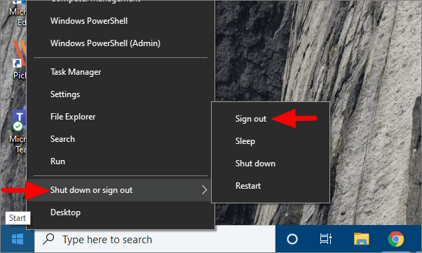 Once you have created the new account, right-click on the windows icon at the left of the taskbar. Now move the cursor over ‘Shut down or sign out’, and then select ‘Sign out’ from the menu.