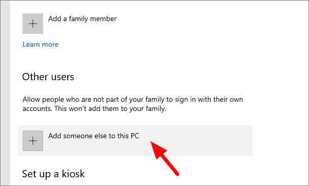 Now select ‘Add someone else to this PC’ under ‘Other users’.