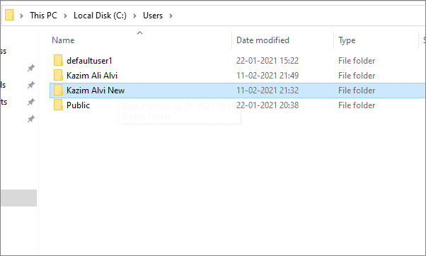 You will see the new user folder name reflecting on the window.