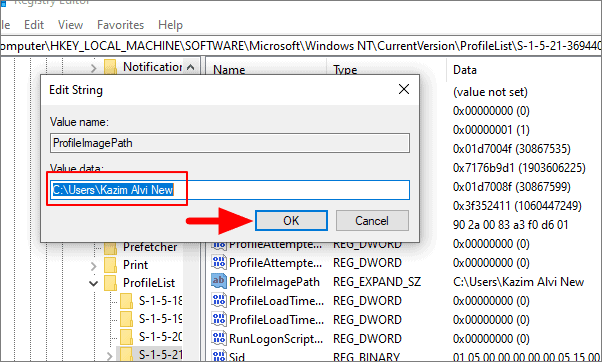 Search for the SID you noted above the sidebar and open it. Now, double click on ‘ProfileImagePath’ key from the list. Enter the new user folder name in the box below ‘Value data’ and then click on ‘OK’. This should be the same as the one entered in the File Explorer.