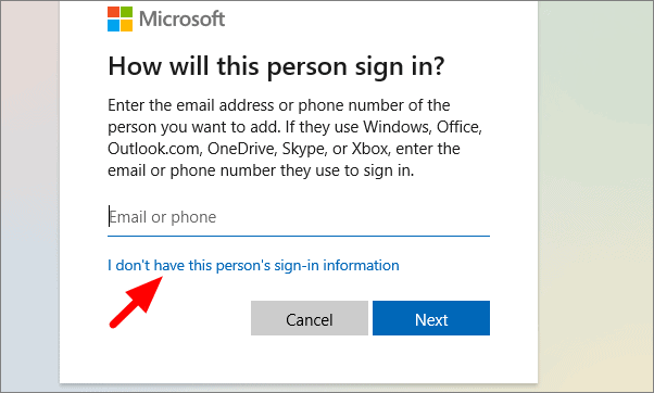 It will now ask you for the email id or phone number of the user. Since we intend to create a local account, click on ‘I don’t have this person’s sign-in information’ at the bottom.