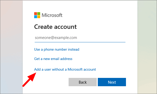 On the next page, select ‘Add a user without a Microsoft account’.