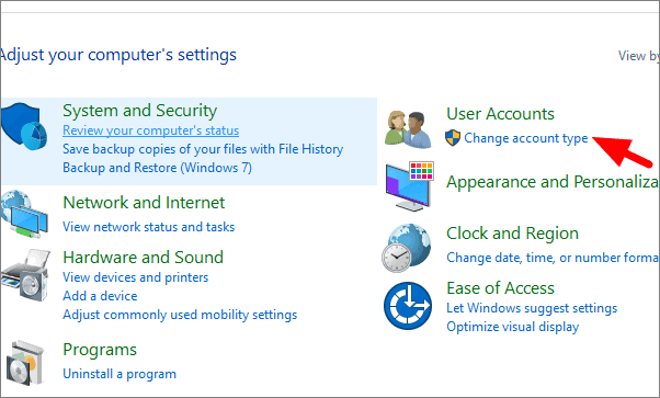Click on ‘Change account type’ under User Account in the Control Panel.