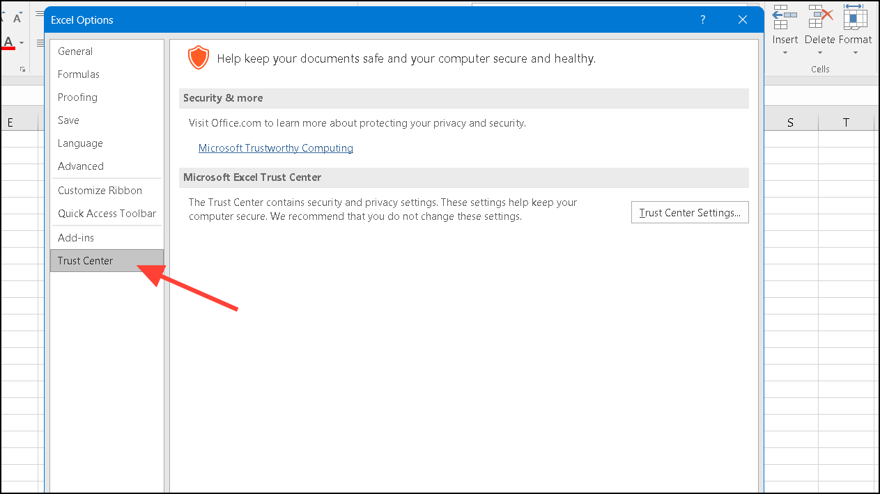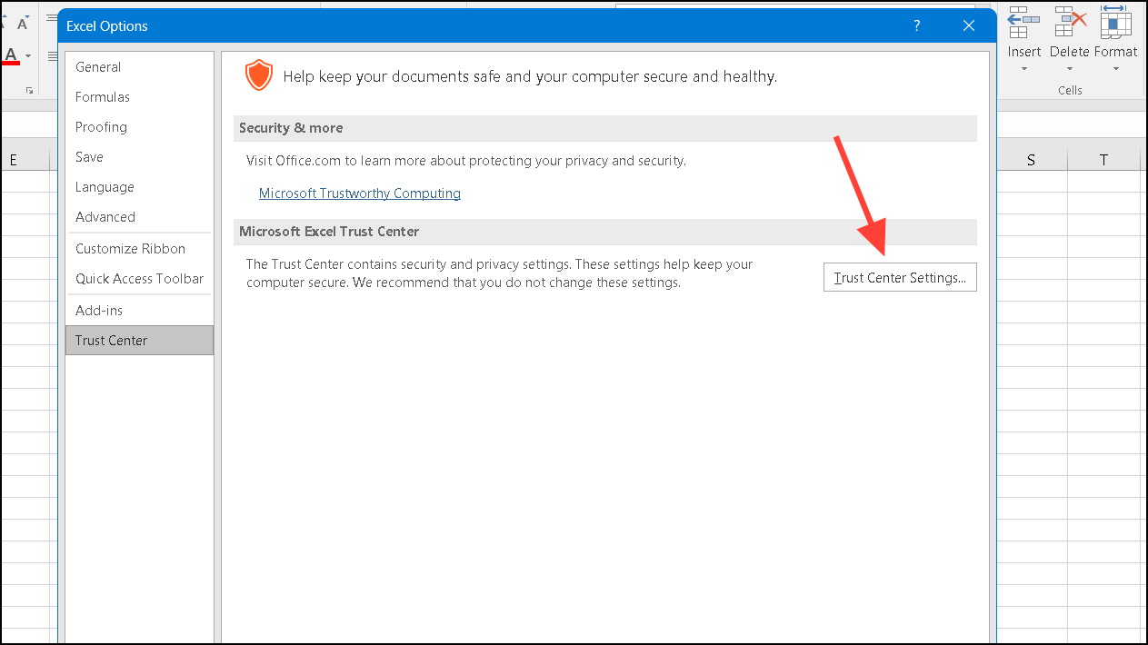Excel's Trust Center is a feature that protects your computer from harm by opening risky files in a restricted mode. You can disable this feature to try and open your corrupted Excel workbook.