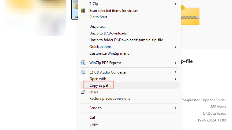 - Navigate to where the corrupted ZIP file is located, then right-click on it and click on 'Copy as Path'.