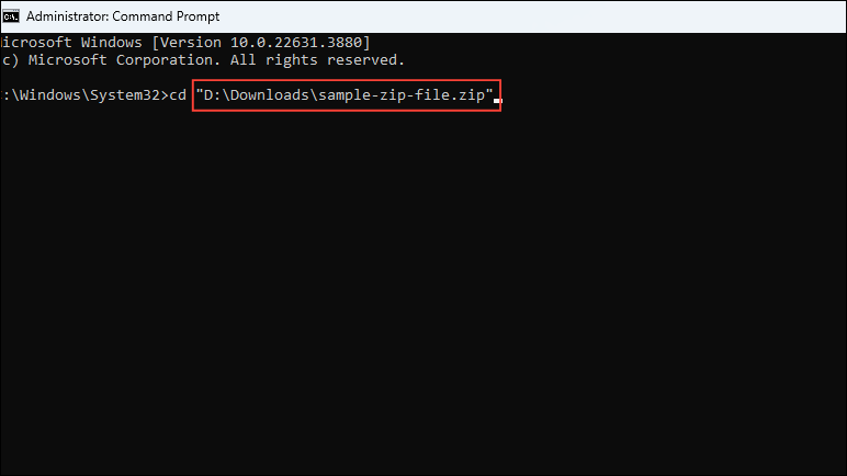 cdand paste the path of the corrupted ZIP file you copied earlier. Then press the 'Enter' key.